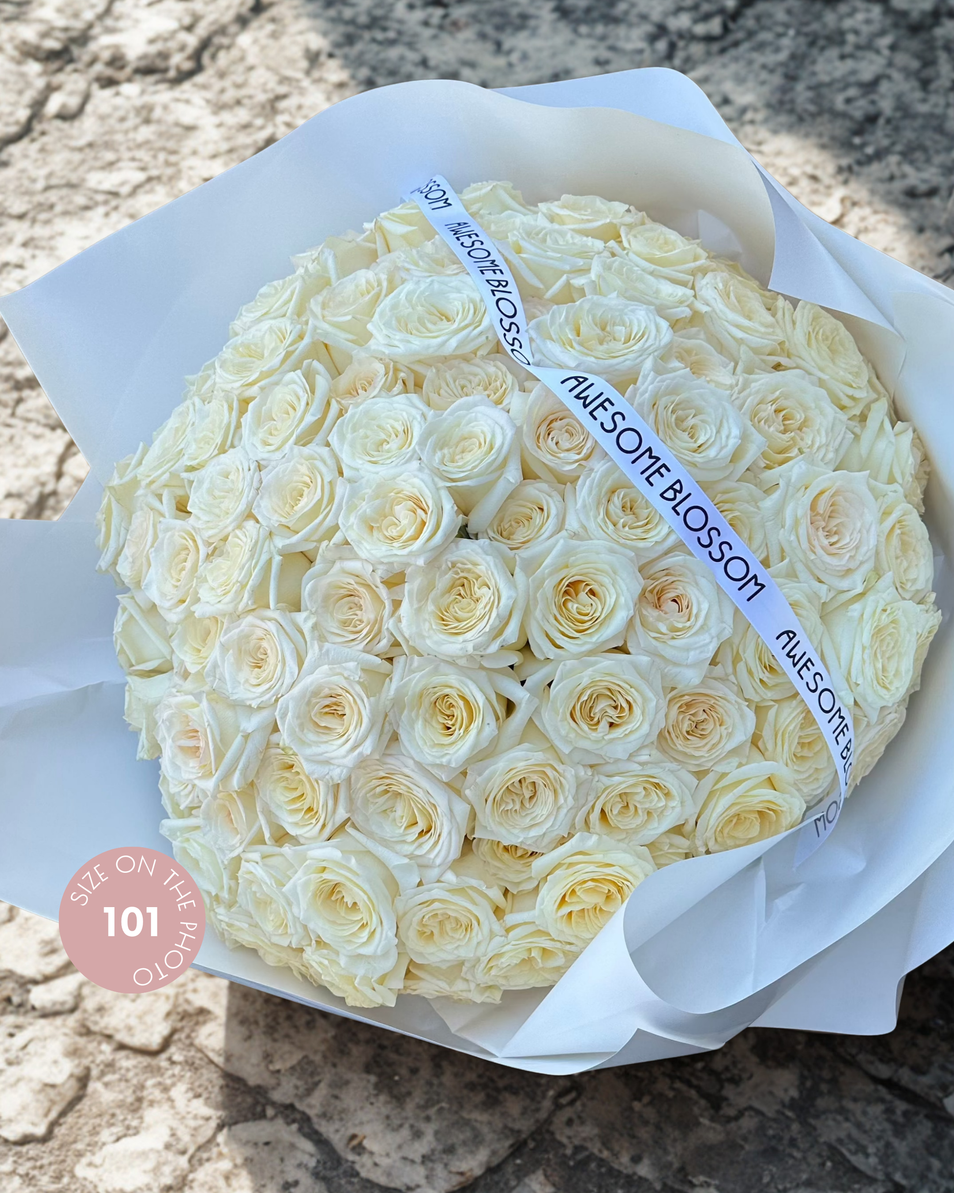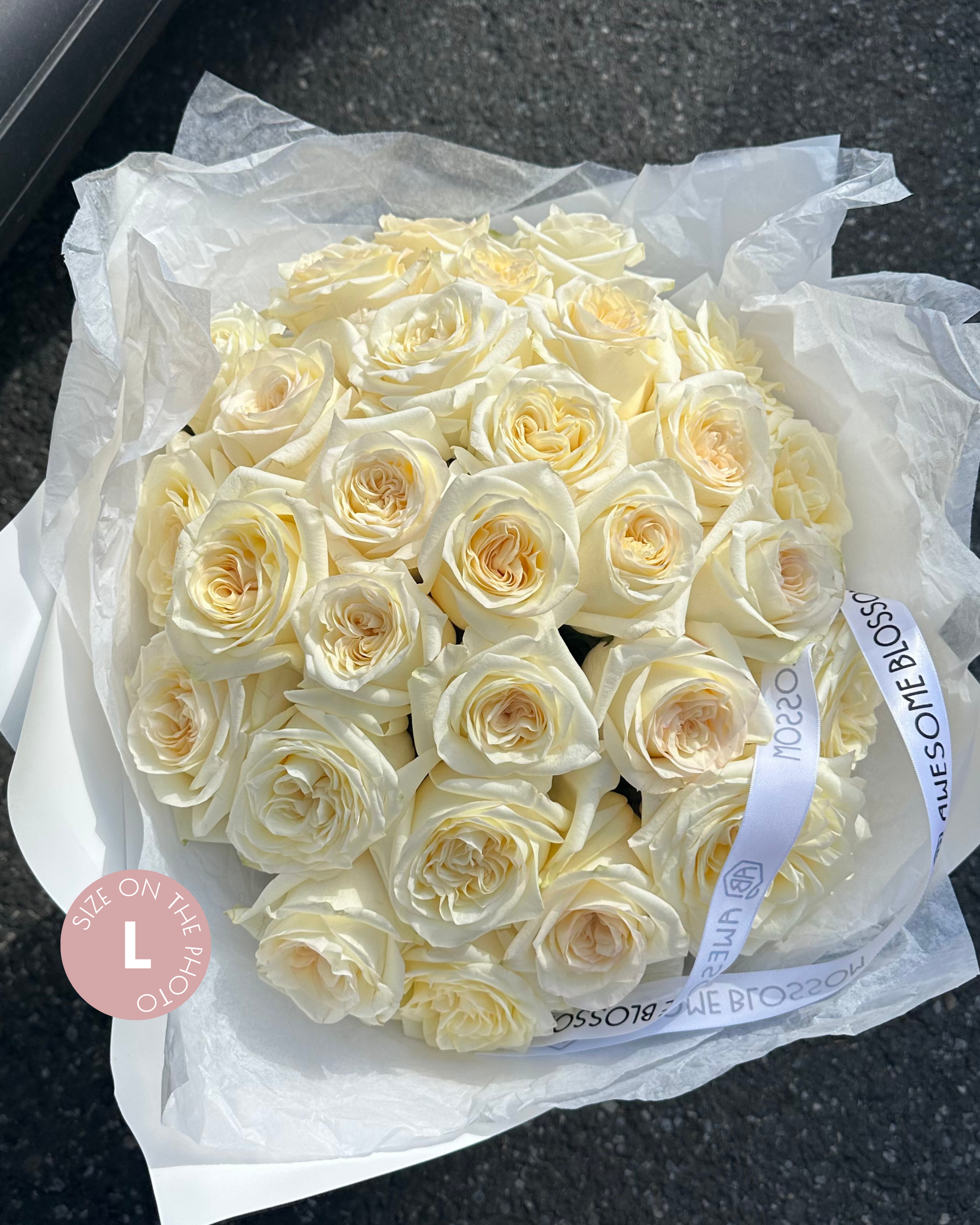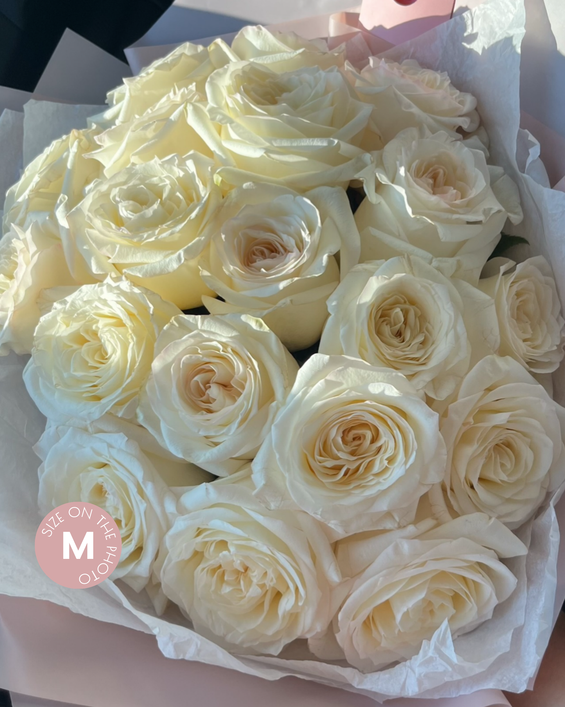 Embrace the pure elegance of our cream roses bouquet, a symbol of timeless beauty and grace. Each handpicked rose exudes a sense of purity and serenity, creating a captivating arrangement that is perfect for weddings, anniversaries, or any special occasion. Delicately crafted with meticulous attention to detail, this white roses bouquet is sure to make a lasting impression and evoke feelings of love and admiration.